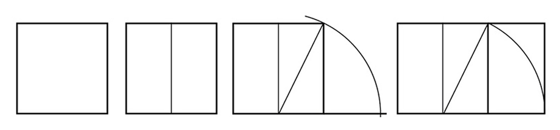 La costruzione del rettangolo aureo, data l’altezza, si realizza appunto attraverso il ribaltamento della diagonale di mezzo quadrato.